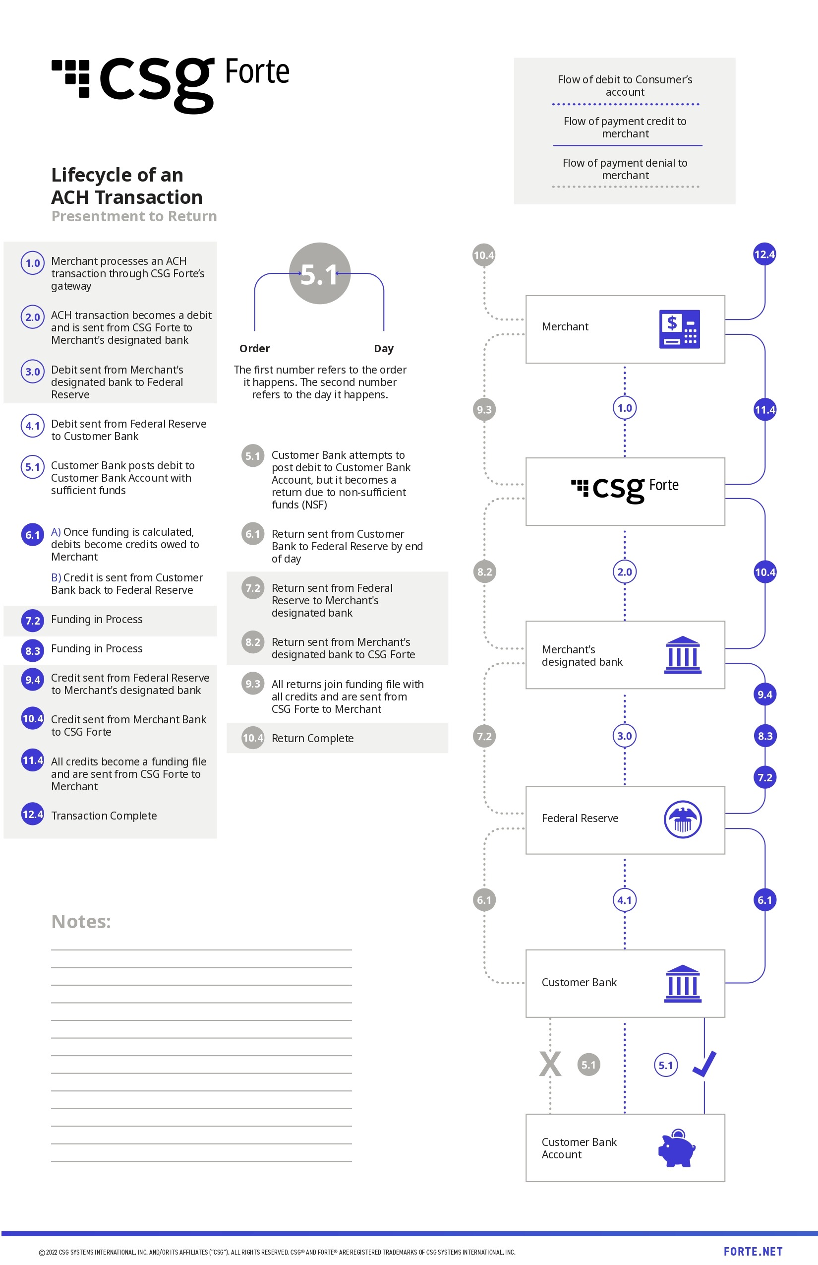 Overview of transaction and verification codes used in CSG Forte payment processing, including status, response, return, settlement, AVS, and CVV codes. | |