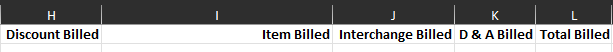- Columns H-L— consist of what CSG Forte bills the merchant—Discount Billed, Item Billed, Interchange Billed, Dues & Assessments Billed and Total Billed. **If CSG Forte is billing the reseller, these columns will be blank.**