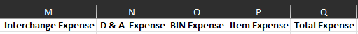 - Columns M-Q— consist of what the ISO/ISV expense is— Interchange Expense, Dues & Assessments Expense, BIN Expense, Item Expense, and Total Expense.