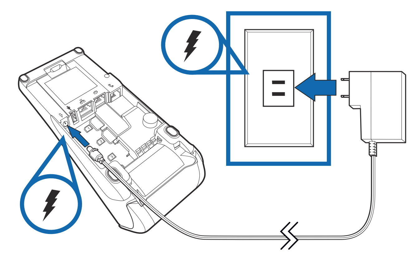 Caution: Do not plug the power pack into an outdoor outlet or operate the terminal outdoors. Disconnecting the power during a transaction may cause transaction data files not yet stored in terminal to be lost. To protect against possible damage caused by lightning strikes and electrical surges, consider installing a power surge protector. |