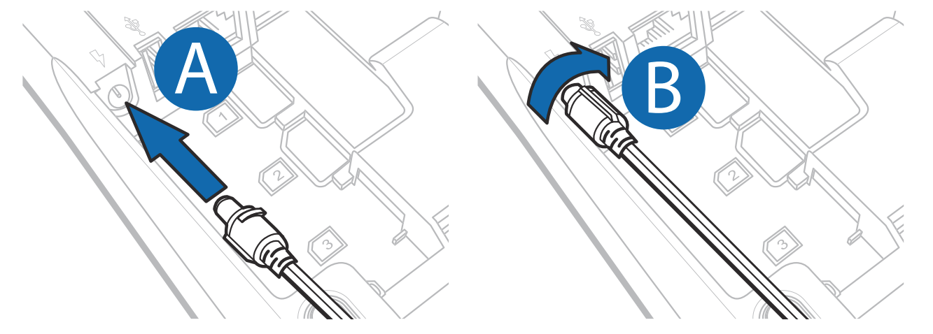 7. After inserting the round barrel connector into the power port, you can lock the barrel connector to keep it engaged to the terminal even when an installation tensions the power cord.