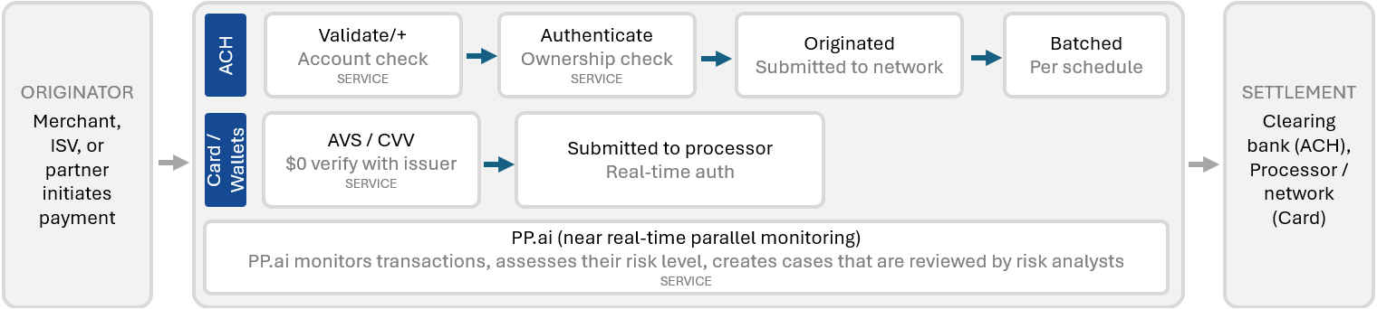 PP.ai | Detects fraud patterns and suspicious activity across ACH and card in near real-time. | ACH + Card + Wallets | Near real-time |
